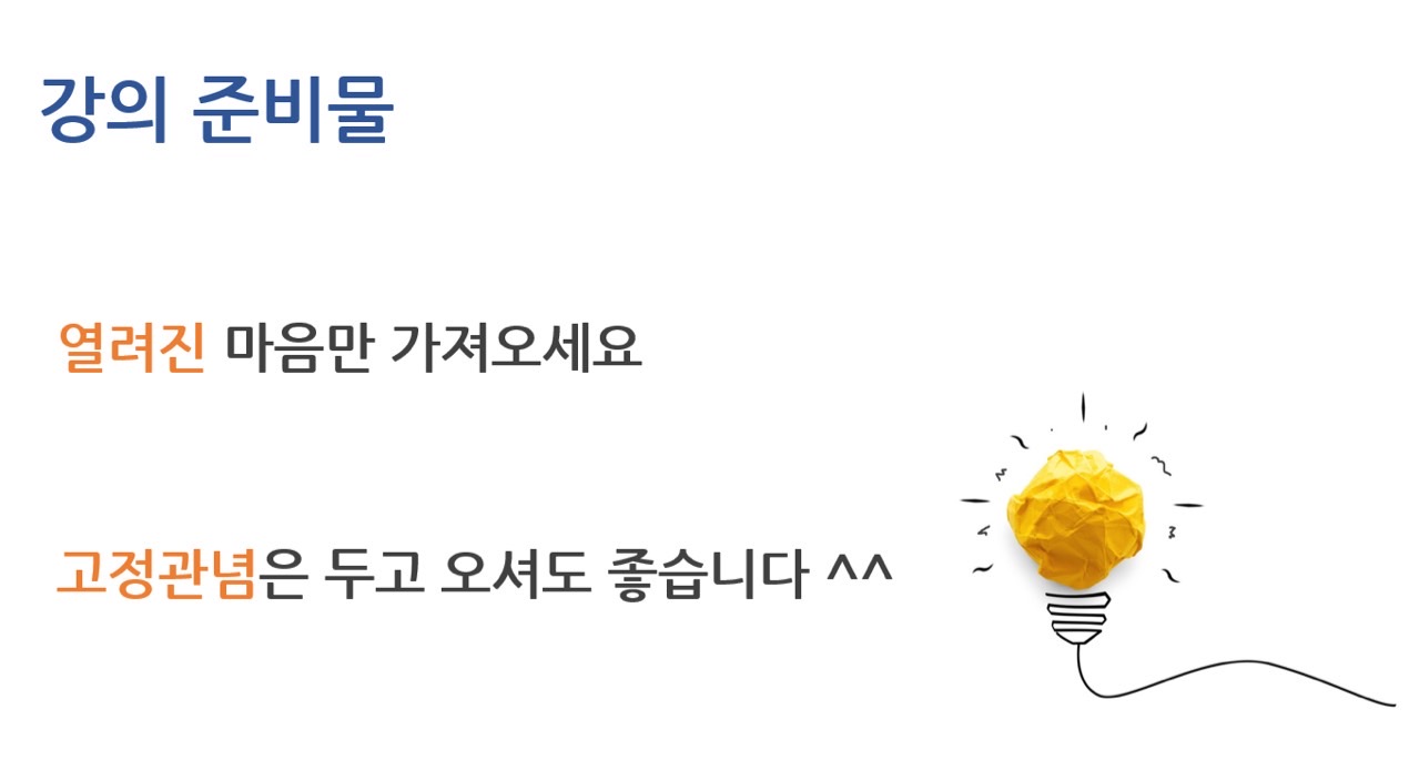 선배님은 강의 준비물은 열린 마음 가져오기. 고정관념은 두고 오기를 밴드에 공지하셨습니다. 강의를 다 듣고 보니 정말 중요한 준비물이었습니다.