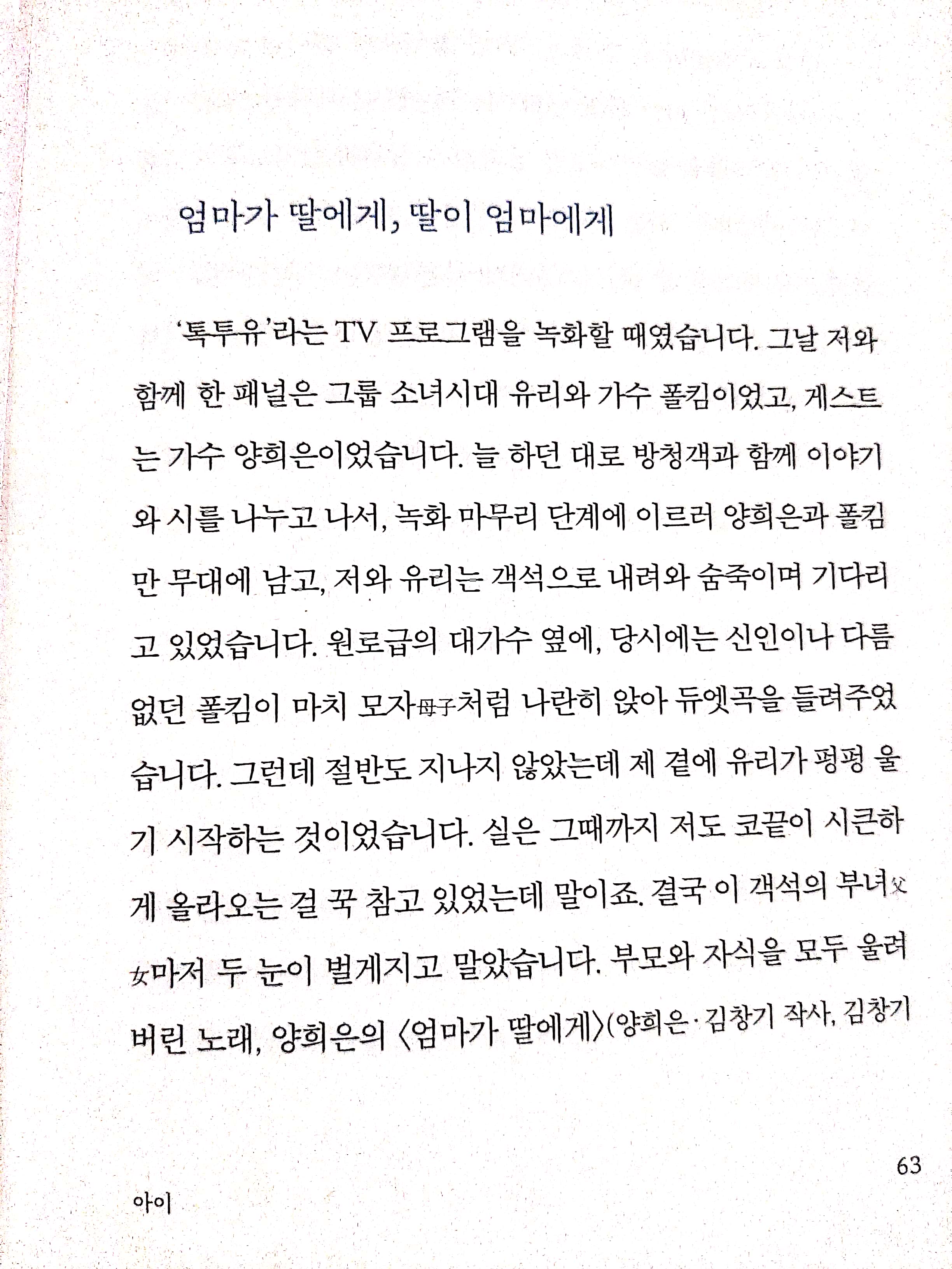 그런데 마침 그날 방송 녹화시의 에피소드를 교수님이 책에 쓰신 것입니다. 이 책을 읽으며 그 날의 현장에 있었던 저는 새록새록 떠오르는 기억으로 감회가 남다릅니다. 그날 양희은님의 ' 엄마가 딸에게'노래를 듣고 저도 결혼을 앞둔 딸도 함께 눈시울을 적셨던 기억이 납니다.