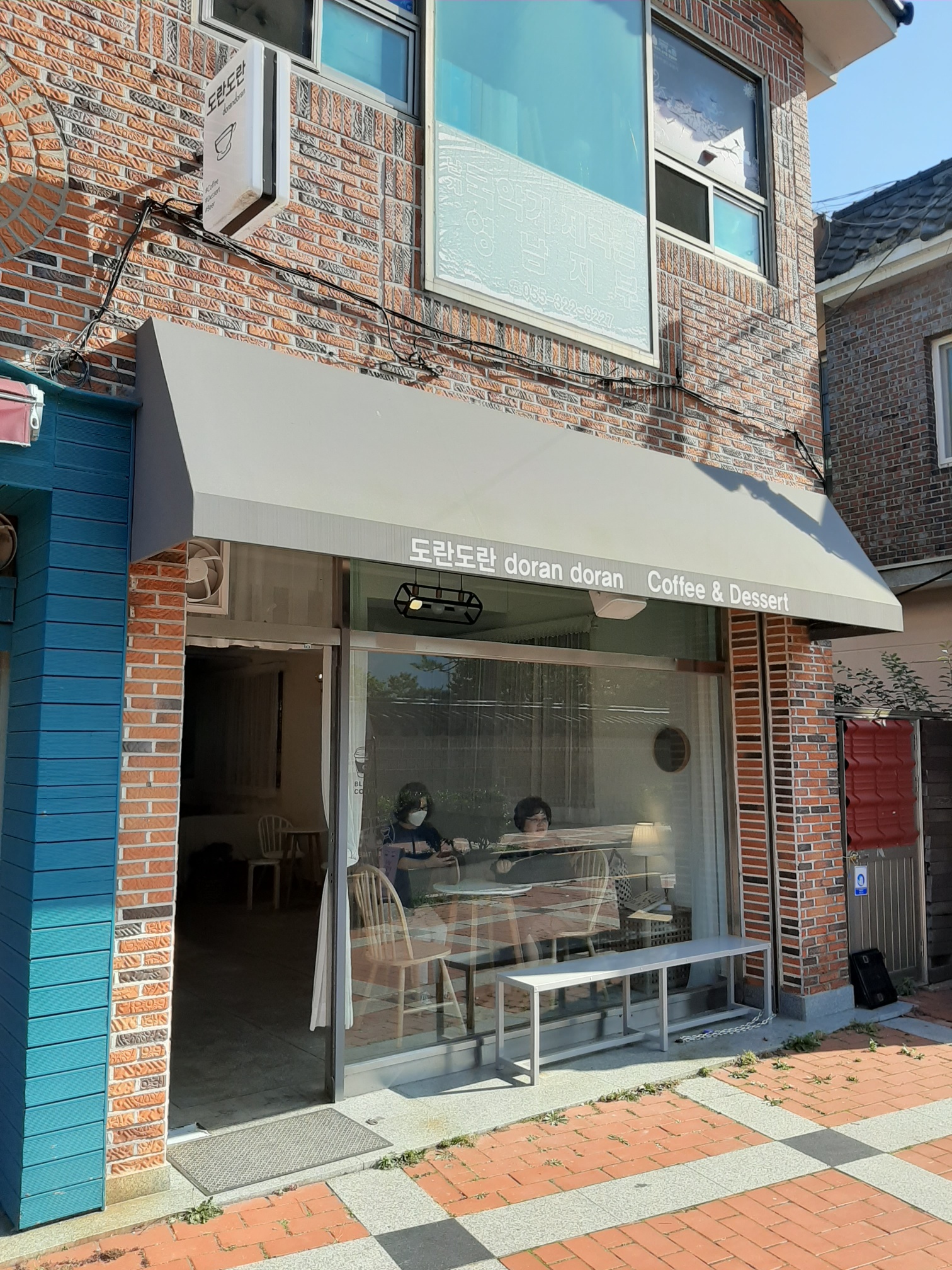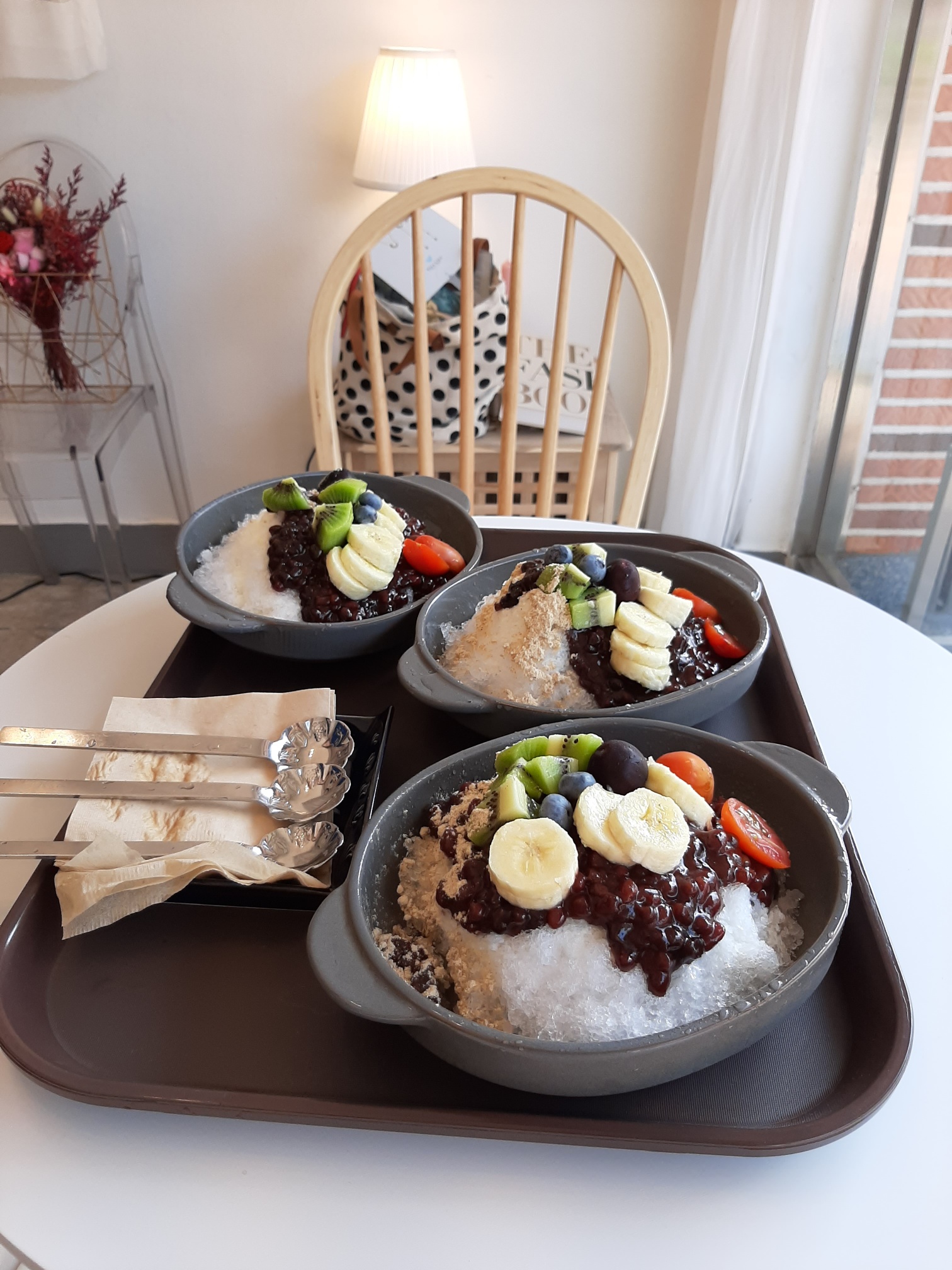 한낮의 열기로 약간의 갈증을 느끼며 수로왕릉 정문의 골목에서 뜻밖의 소박한 카페를 발견했습니다.'도란도란' 카페 이름만큼이나 규모도 아기자기 소박합니다. 점심 식사 후 배가 여전히 부른 상태이고 찬 것을 많이 못 먹을 듯해서 옛날 빙수 큰 것 하나를 주문했습니다. 코로나로 염려되니 세 그릇으로 나누어 정성껏 주었어요. 카페 주인장의 친절로 도란도란 '소확행'을 확실히 느낍니다.
