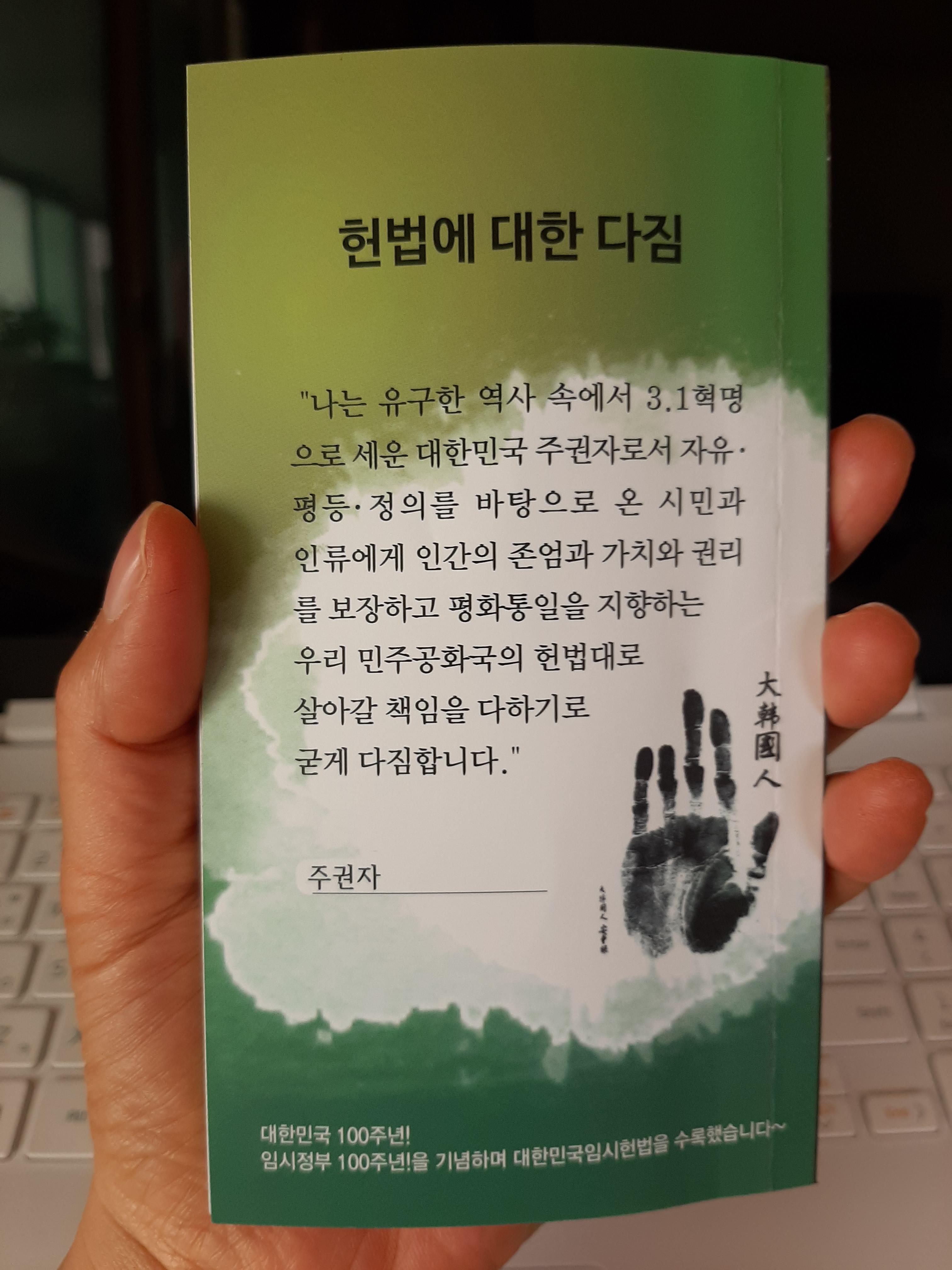 아래의 우리헌법 읽기 국민운동의 '손바닥 헌법책'을 만드는 마음을 인용하면서 함께 동참할 수 있어서 뿌듯했습니다. '민주주의란 인간의 존엄성과 자유 평등을 실현하기 위해 만든 제도'임을 가슴 깊숙이 다시 새겨봅니다.