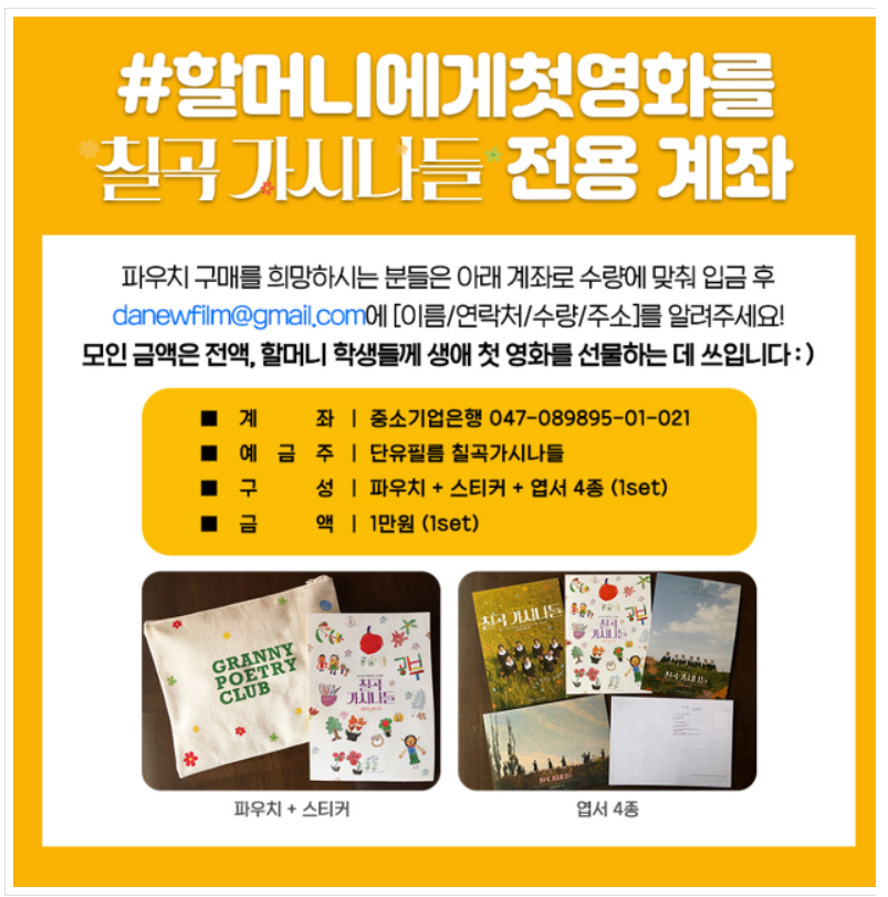 감독님의 독립 다큐영화 <칠곡 가시나들>을 보면서 우리나라의 8090 할머니들의 배움에 대한 열정, 문맹의 설움을 떨치고 즐겁고 재미있게 살아가는 모습을 알게 되었어요!