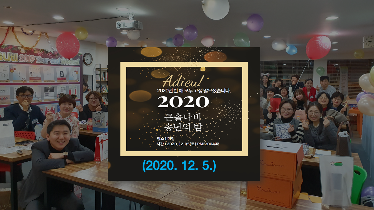 12월 5일 오후 5시에 독서모임 '부산 큰솔 나비 송년회'가 줌으로 열립니다. 코로나로 인해 어쩔 수 없이 줌으로 비대면으로 열리는 송년회가 아쉽습니다.