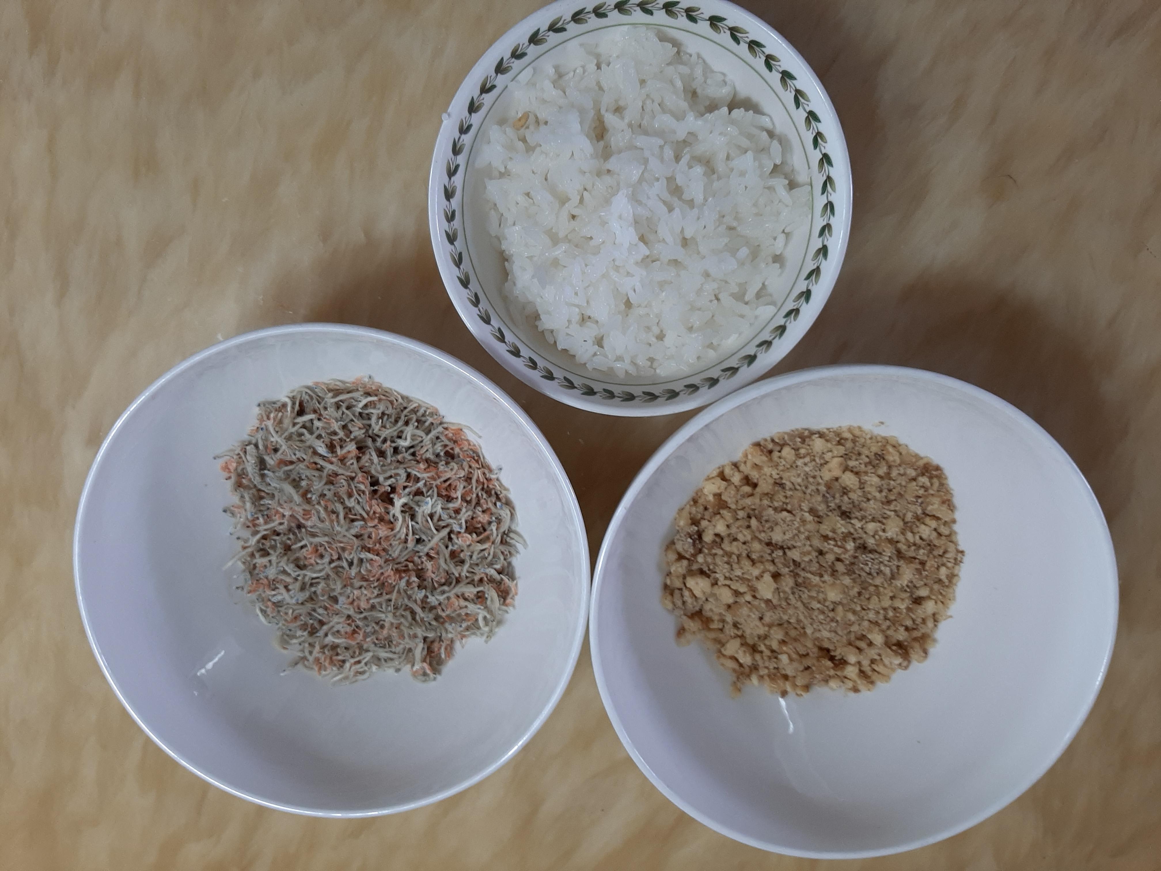 재료 :밥 한 공기, 밥새우 1/3~1/4 공기 분량, 호두 5 알, 도시락 김 2 매, 참기름 조금