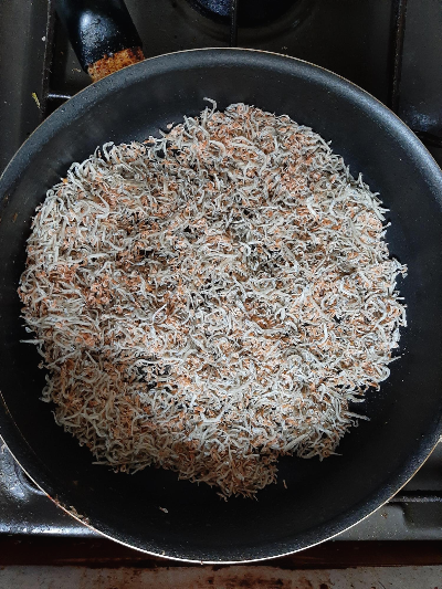 우선 밥새우를 프라이팬에 기름을 두르지 않고 비린내를 없애기 위해 5분 정도 볶아 줍니다.