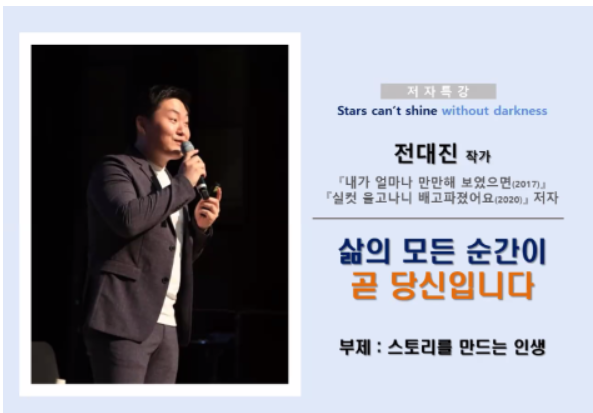 겸손하게 저자 특강을 사행시로 띄우며 강연을 시작했습니다. 전대진 작가님은 이름으로 시를 지어주는 '네임 스토리 창시 작가'로도 유명합니다.