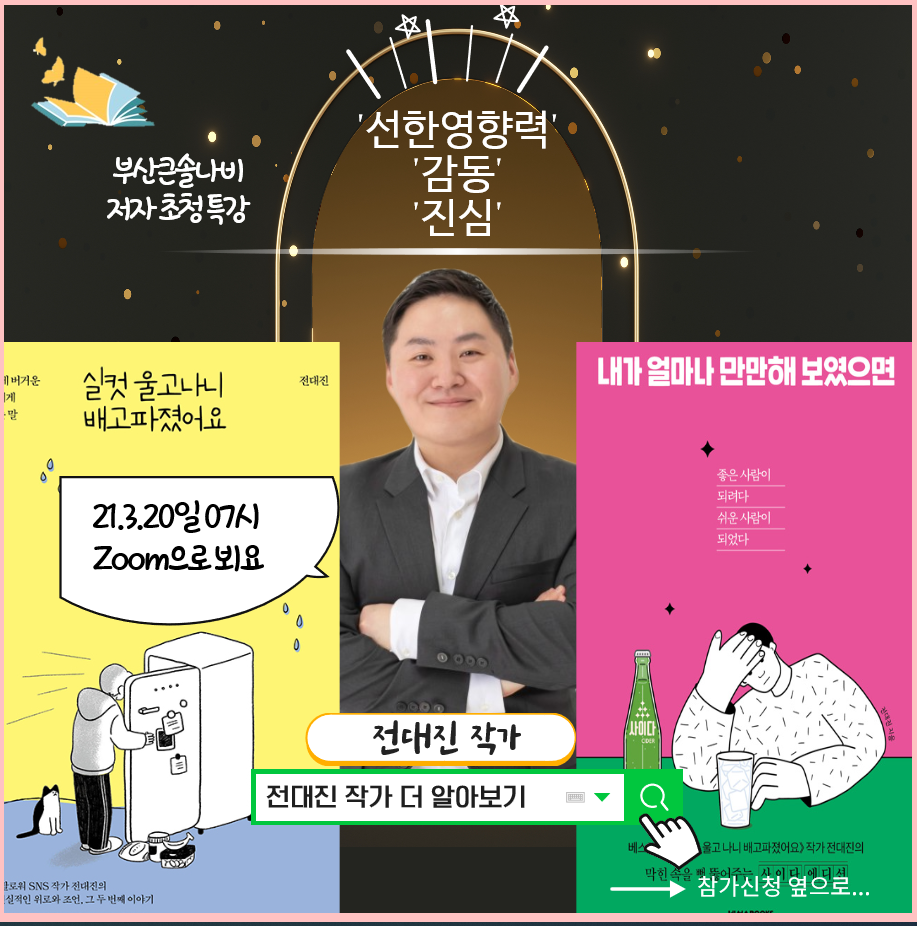 부산 큰솔 나비 독서모임에서 저자 특강으로 전대진 작가님을 모셨습니다. 비록 줌으로 하는 특강이었지만 그 열기는 아주 뜨거웠습니다. <실컷 울고 났더니 배고파졌어요>를 읽으면서 공감 가는 부분이 많았습니다. 저자는 주변으로부터 상처를 많이 받았지만, 그 상처로 무너지지 않고 오히려 극복의 원동력으로 삼는 분이었습니다. 자신의 상처와 고통이 컸기에 다른 이의 아픔을 들여다보는 공감력이 커진 것입니다. 타인의 아픔을 달래주는 것을 자신의 사명으로 간직하며 함께 성장하며 오늘을 살아가는 분이라고 생각했습니다.