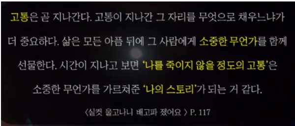 나락의 시간이 주어졌을 때 그 시간들은 그냥 주어진 것들이 아니라 내가 성장할 수 있는 스토리가 되어주는 시간이었다면서 삶의 모든 순간들이 소중했음을 강조합니다. 다만 그 힘든 시간이 하필이면 나에게 일어났는가 (Why me?)가 아니라 그래서 무엇을( So What?) 해야 하나로, 자신의 내일을 향한 거름으로 삼아야 한다는 것입니다.