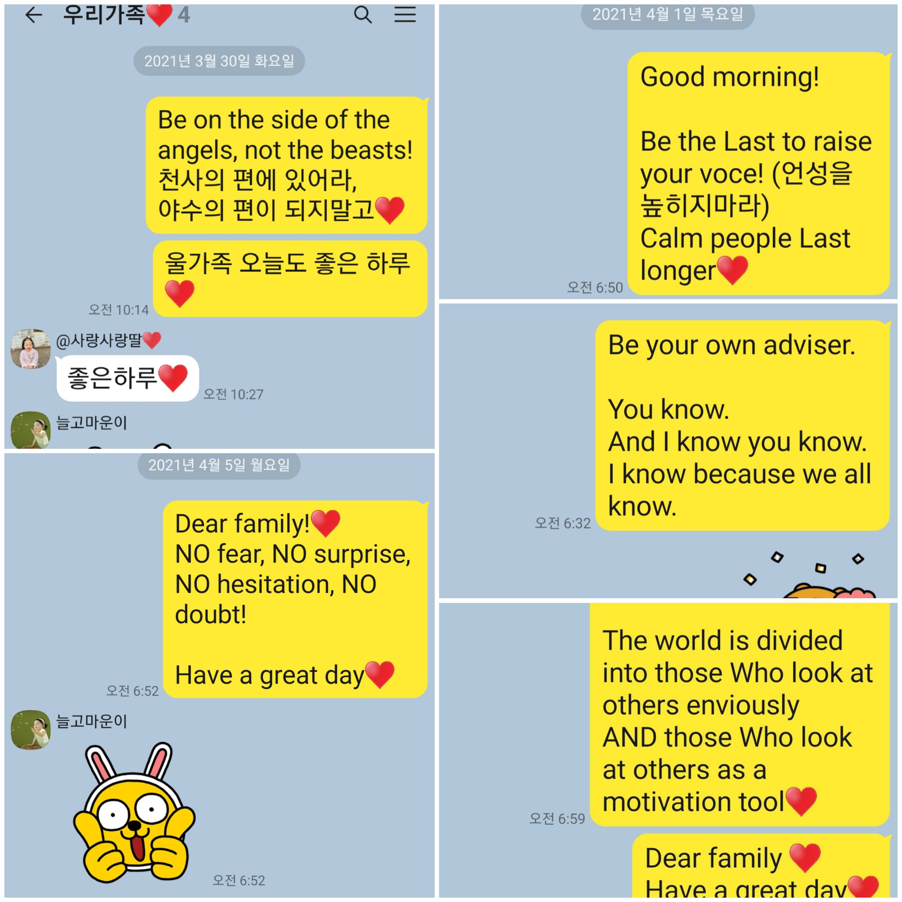 매일 좋은 하루를 기원하며 새기고 싶은 글귀를 가족방에 올려보기로 했다. 그냥 읽고 지나가는 것보다 이렇게 가족방에 쓰면서 읽으니 더 깊이 와 닿는 글들이 된다.