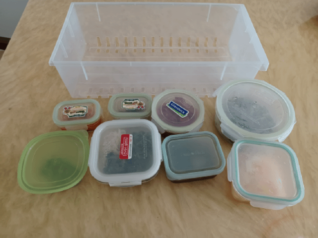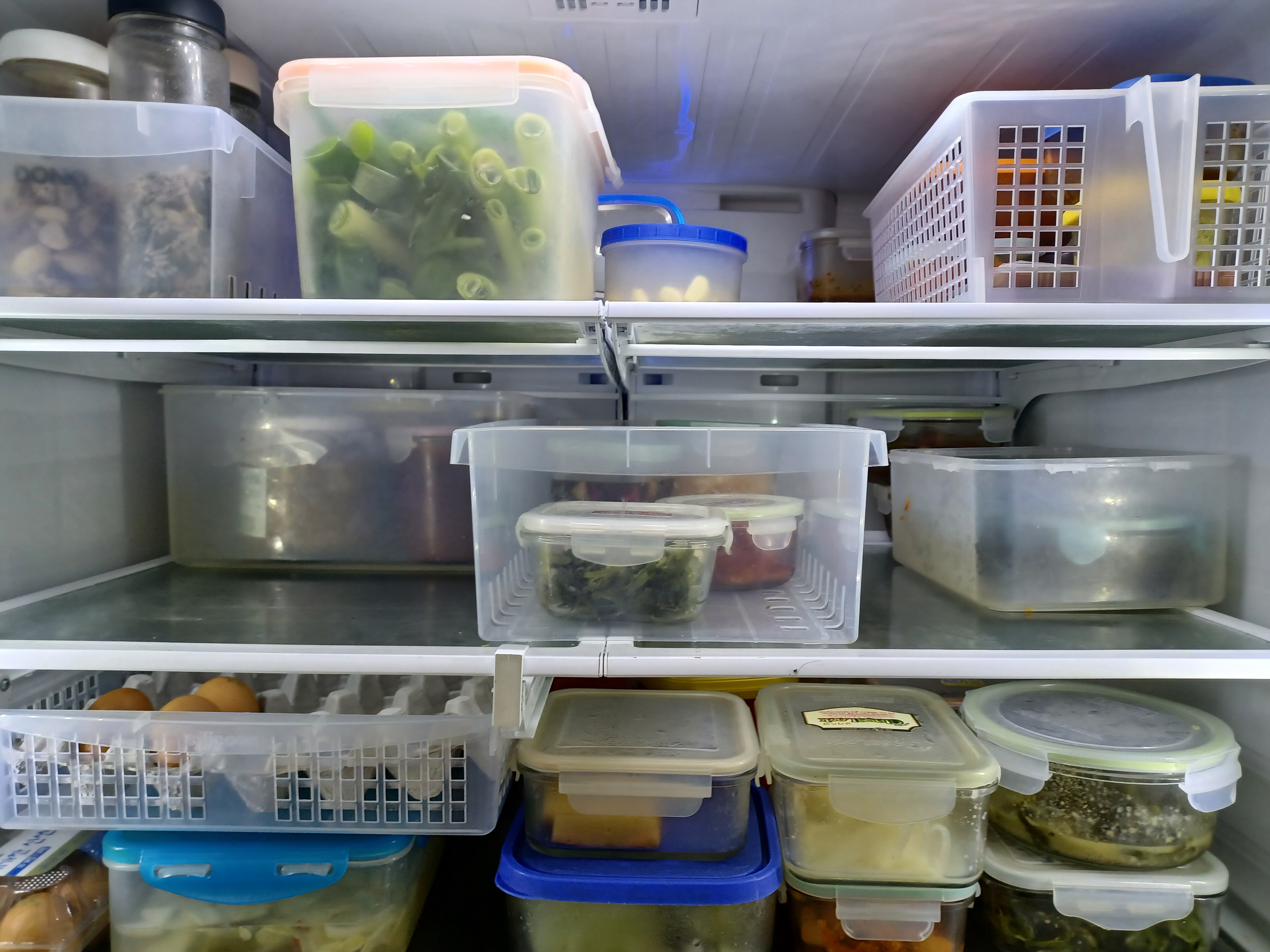 냉장고에는 매끼마다 먹는 반찬들을 큰 투명 상자에 넣어서(다이소에서 쉽게 구매 가능) 그 통만 꺼내면 한 끼 식사를 할 수 있도록 정리합니다. 장아찌류 등 가끔 먹는 반찬들은 다른 통에 보관하고, 장 종류들도 한 상자에 보관합니다.