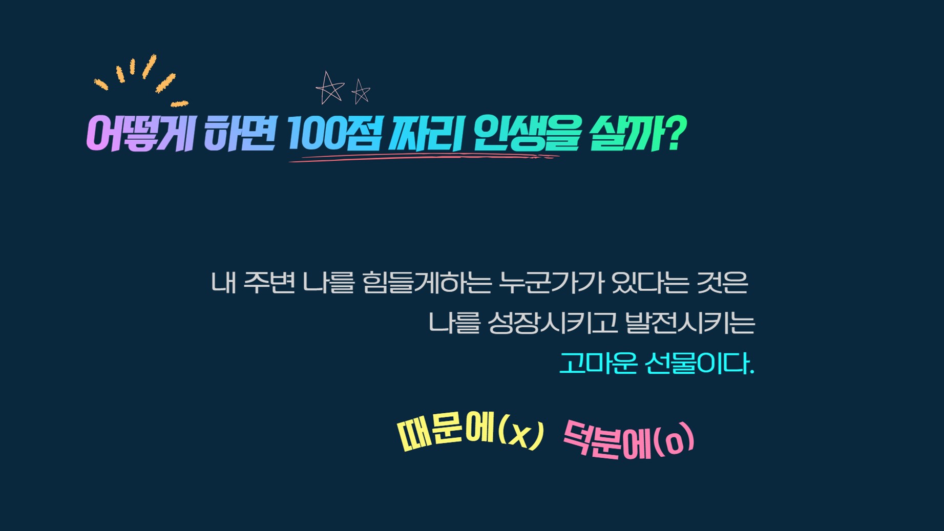 나를 힘들게 하는 요인들과 사람을 '때문에'가 아닌 '덕분에'라고 여기며 선물로 생각하자. 우리의 삶은 종착역이 있다. 그러니 매 순간의 소중함을 일깨워 의미 있고 값지게 살아가야 한다.