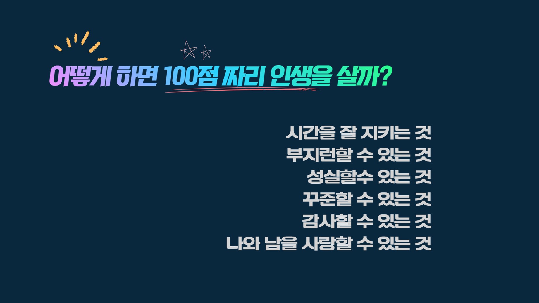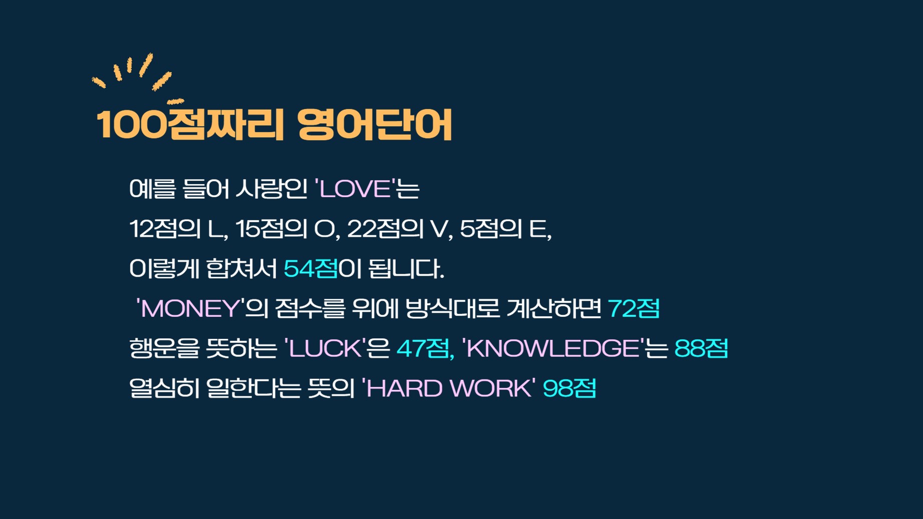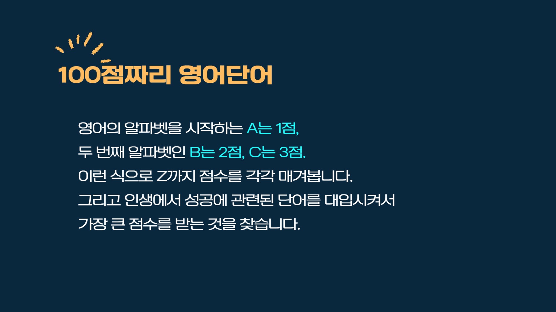 회장님이 '100 점 짜리 영어 단어는 무엇일까?'로 강의를 하셨다.