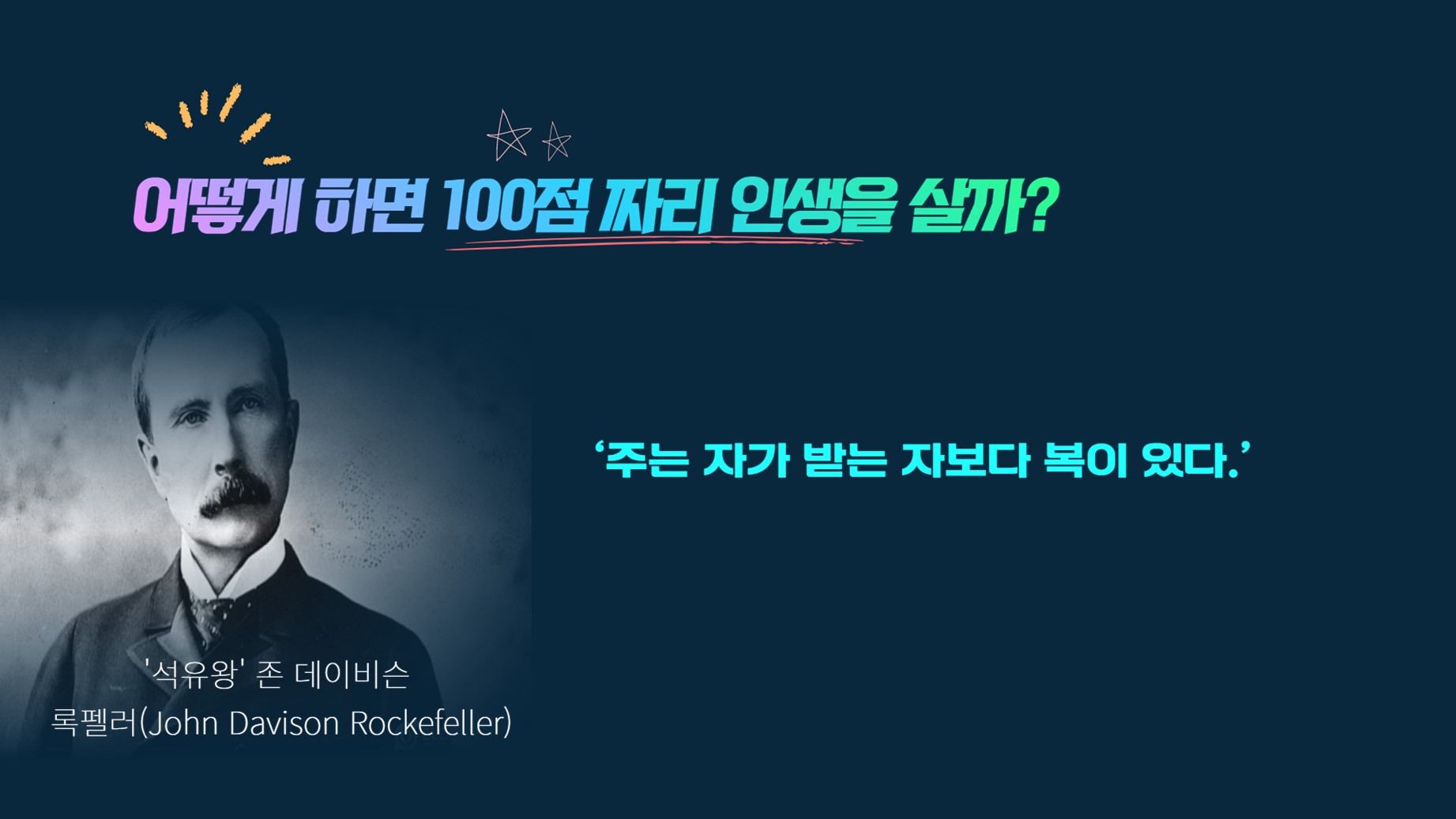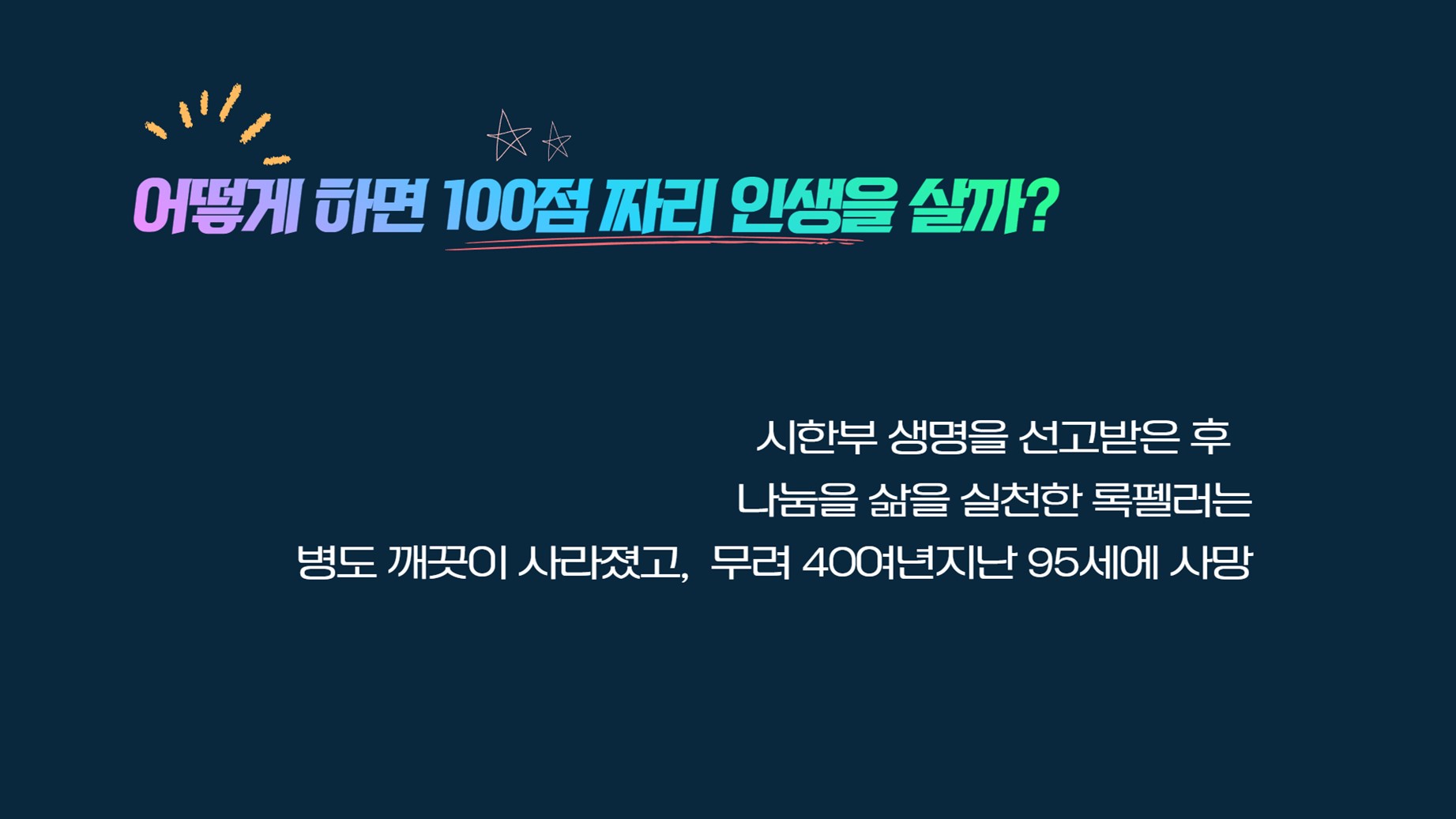 시한부를 선고받은 그가 나눔의 삶을 실천하며 그는 95세까지 행복한 삶을 영위하였다.