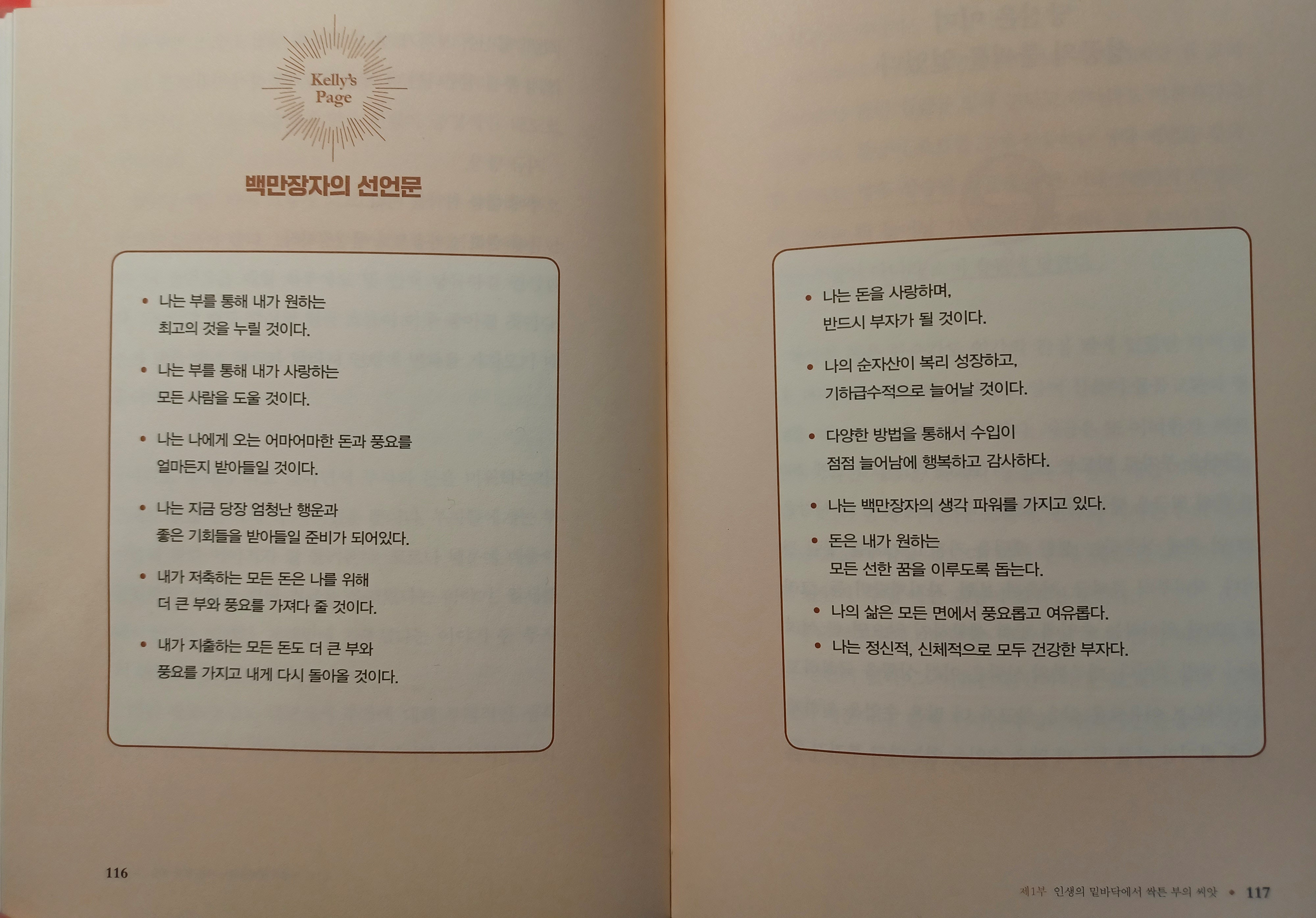 긍정과 감사, 자기 확언으로 목표와 꿈을 현실로 가져오는 과정을 실천하도록 안내하는 책입니다. 백만장자 선언문과 아침 긍정 확언을 되새겨 봅니다.