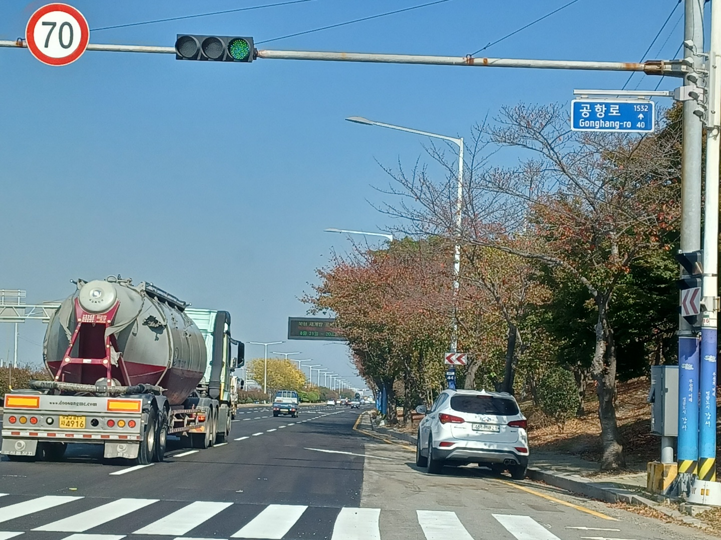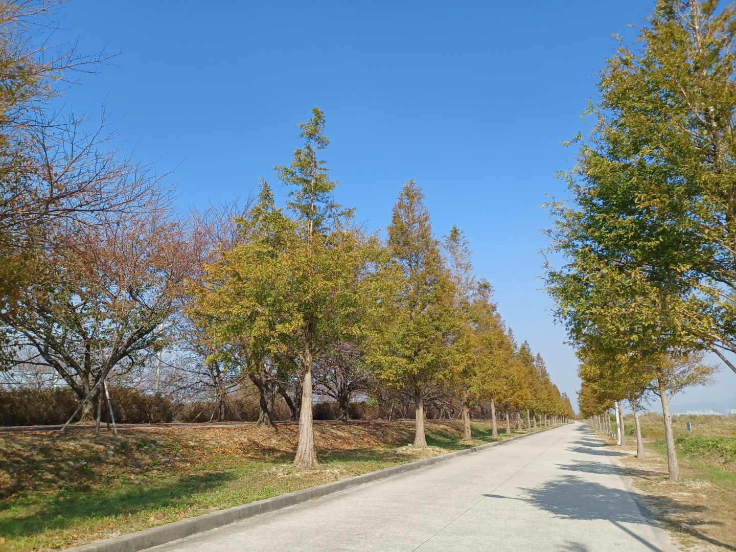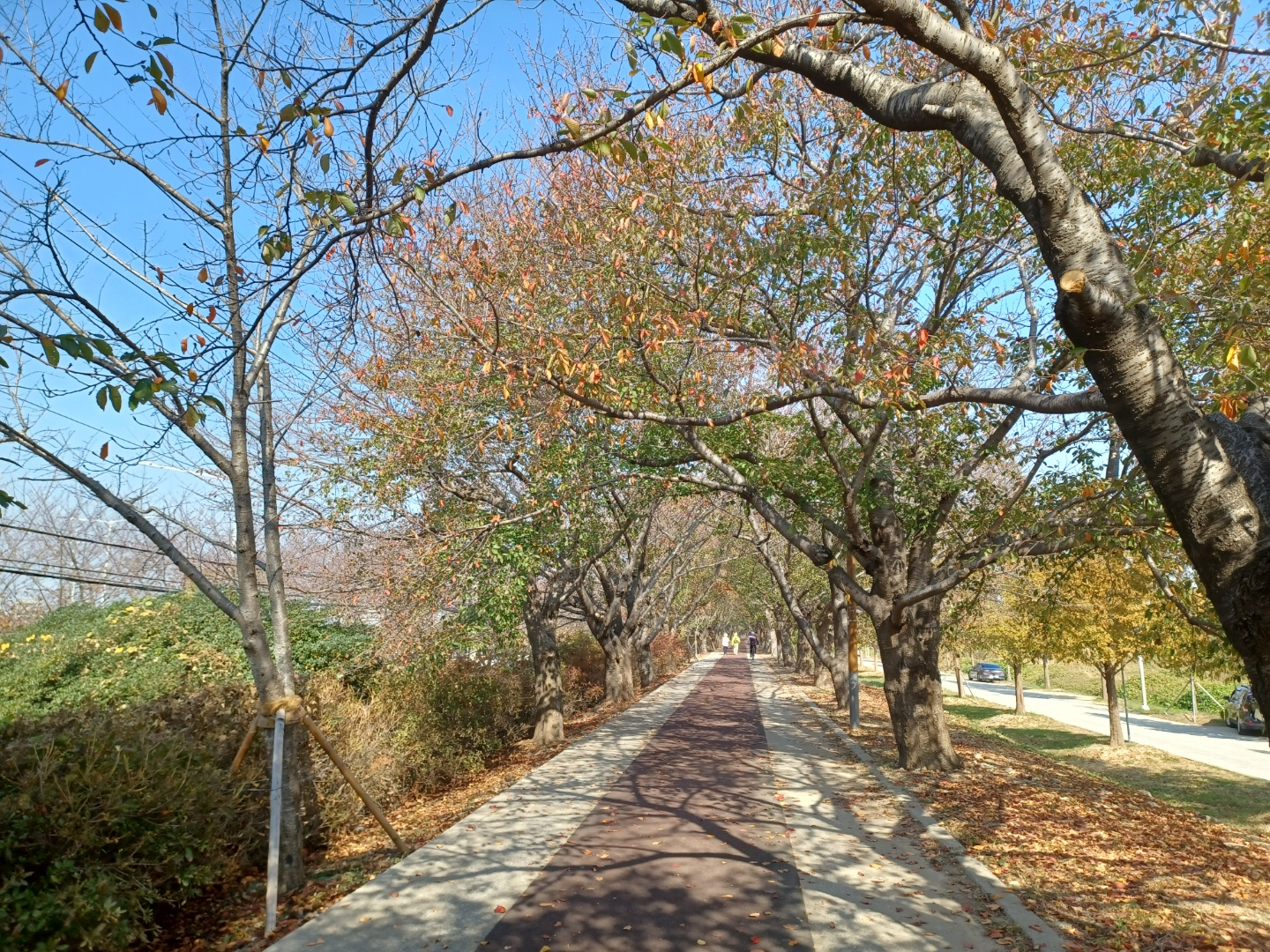 강둑을 넘어서 메타세쿼이아가 길 양쪽으로 심어져 있는 공원 내 도로가 있다. 자동차는 제한 속도 30km 다녀야 하는 이 길은 단체로 자전거를 타는 사람들이 즐기는 길이다. 길 한쪽에 주차를 한 후 바로 강가로 나갈 수 있는 길이 있다. 그 길을 자주 이용한다.