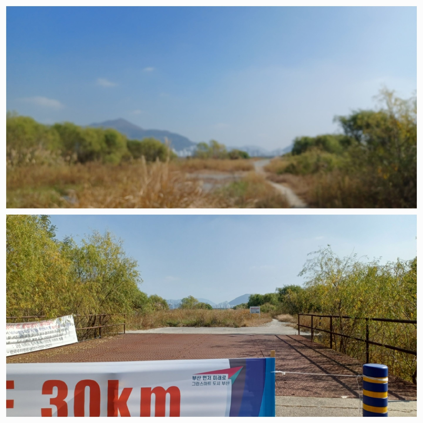 하단에서 하구언 다리를 건넌 후 공항을 향한 길로 우회전하면 첫 번째 신호등을 만난다. 그럼 곧 첫 번째 낙동강 둑으로 향한 길에서 우회전해서 강둑을 올라가야 한다. 큰 이정표는 다른 출입구에 있어서 자칫하면 이 진입로를 놓치기 쉽다.