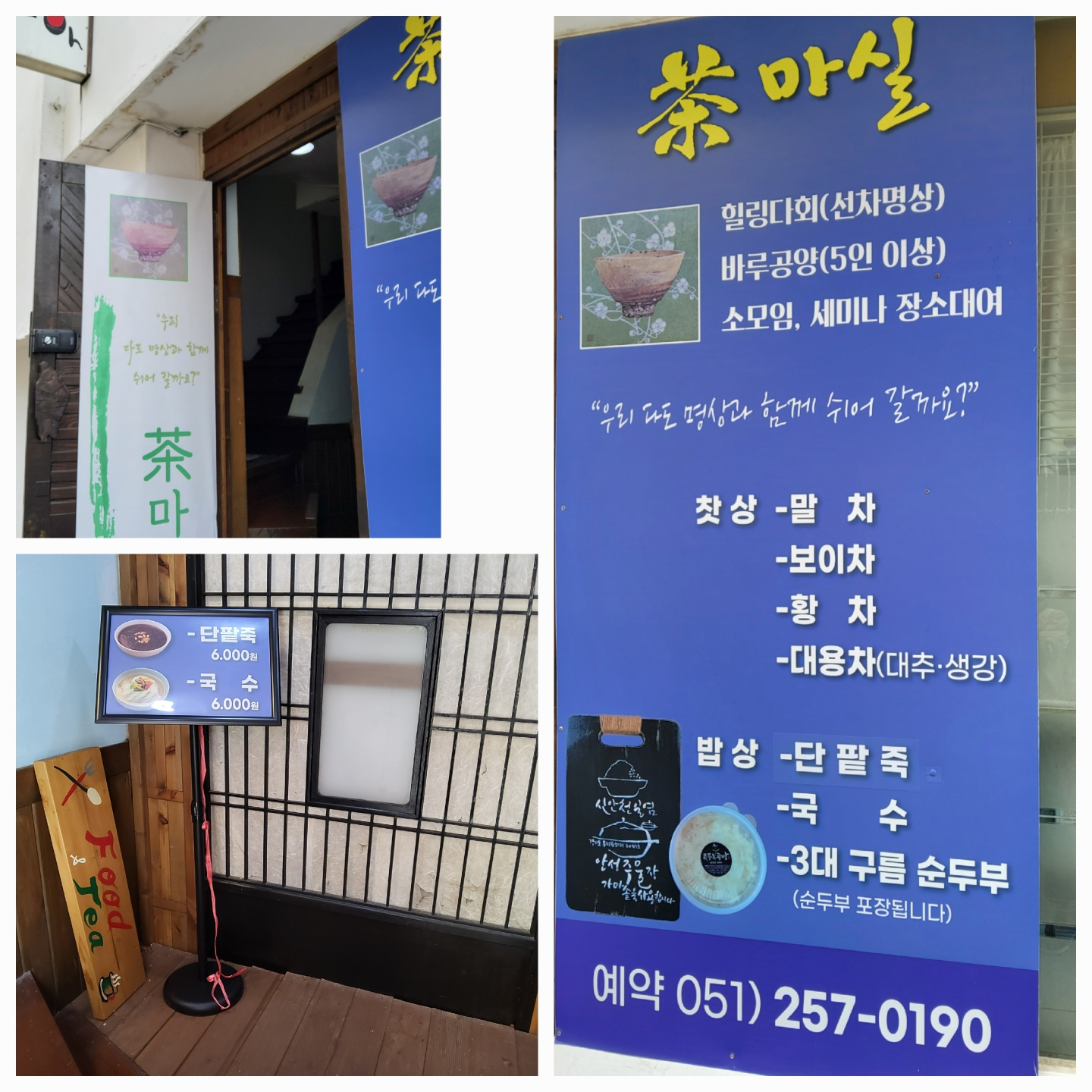 그러다 아주 작은 소박한 간판을 발견했습니다. '茶마실'이라고 쓰여 있었습니다. 시내에서 용두산 공원 쪽을 향하려면 늘 지나다니는 골목인데 그 찻집을 처음 발견했습니다. 식사가 가능한 찻집 같았어요. 점심식사를 이미 한 상태라서 차만 마실 수 있는지 궁금했습니다. 2층으로 연결된 계단입구와 입간판을 보면서 망설이고 있는데 주인인 듯 보이는 중년사장님이 차만도 마실 수 있으니 올라오시라고 했어요.