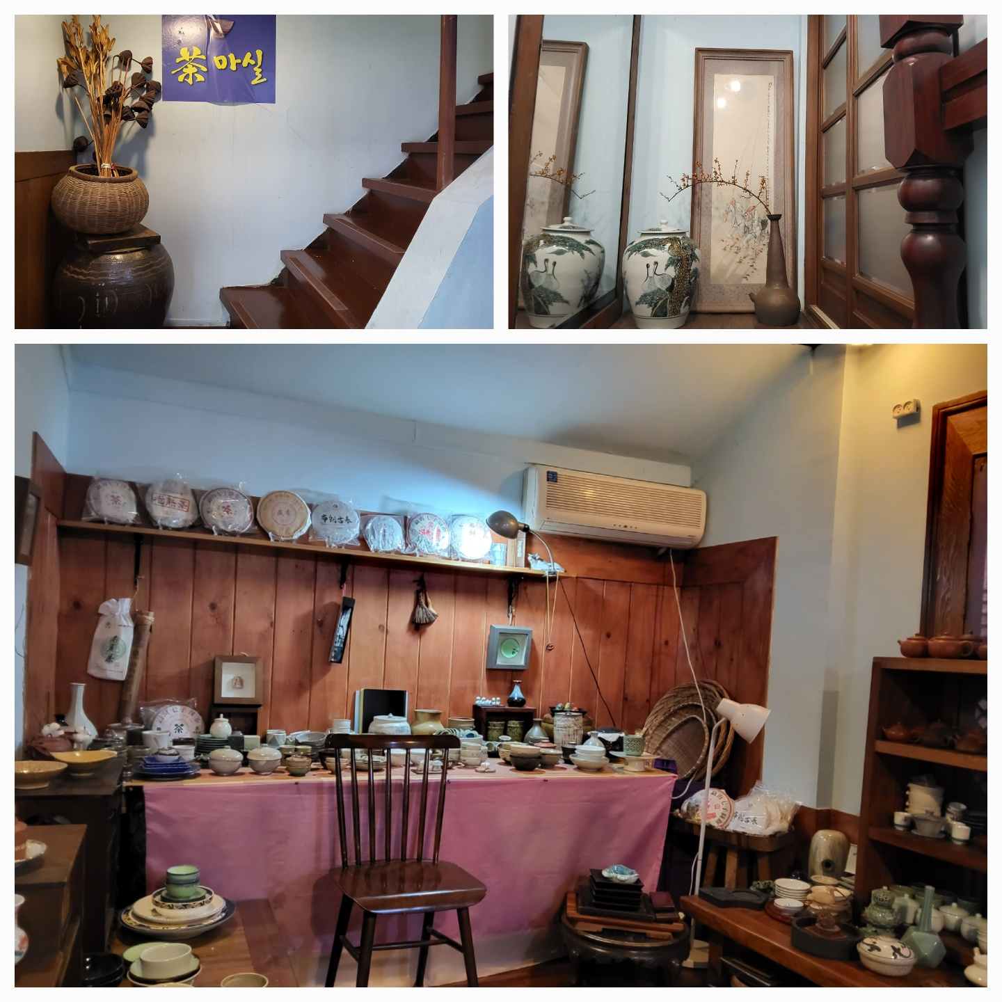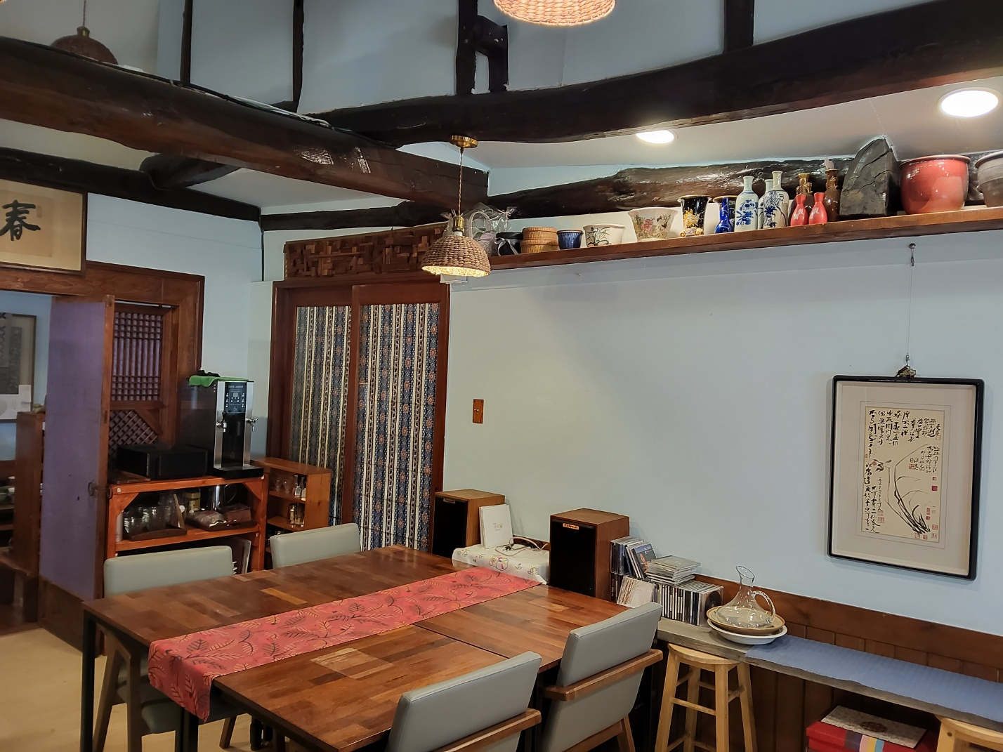나무계단을 따라 2층에 오르니 새의 둥지 같은 작은 전통찻집이 자리하고 있었습니다. 타임머신을 타고 이동한 듯 모든 것이 옛스러웠어요. 오래전 지어진 건물을 그대로 활용한 소박하고 아늑한 찻집이었습니다. 특히 보가 그대로 유지되어 있는 천장이 독특했습니다.